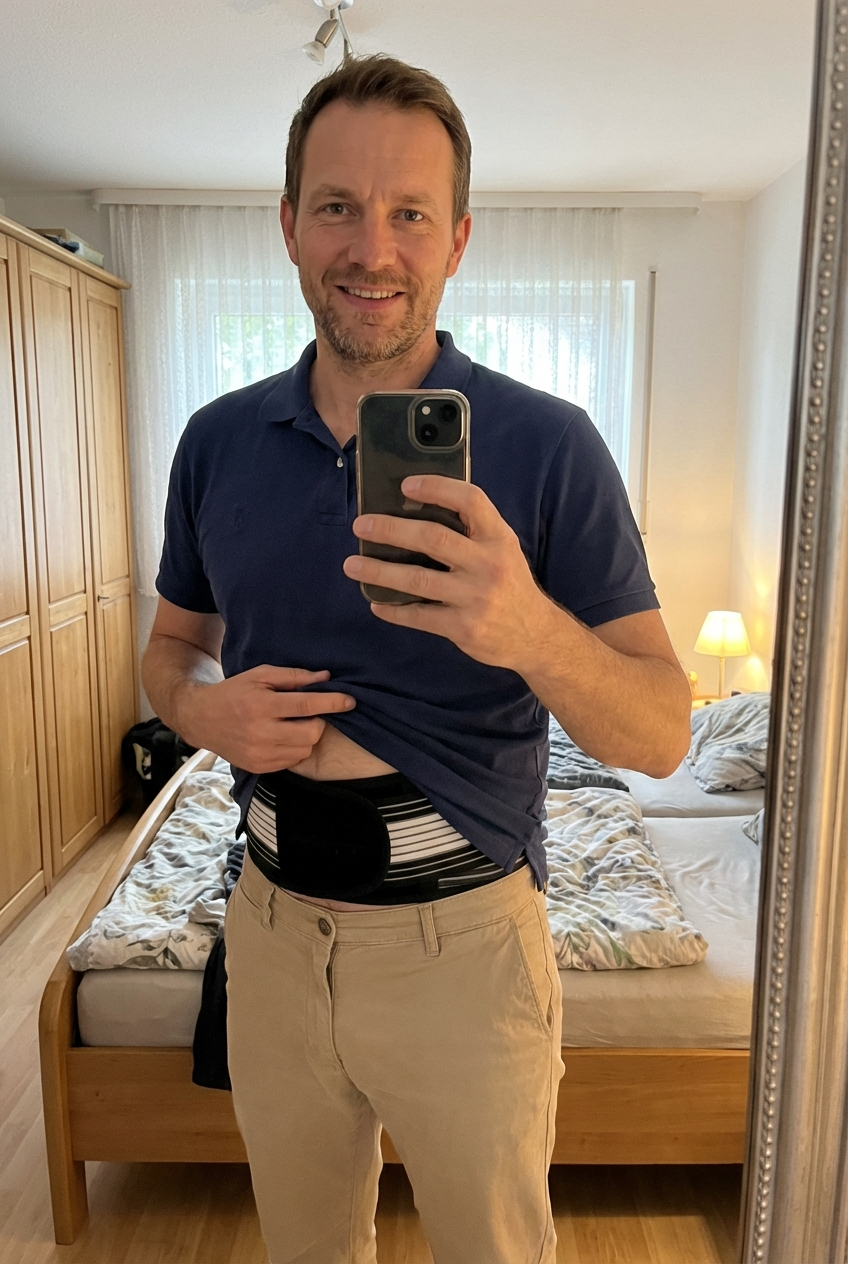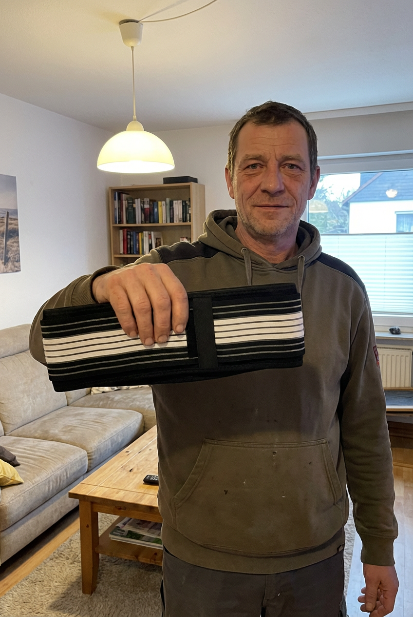 „Ich hatte seit Monaten diese tiefen Schmerzen im unteren Rücken, die bis ins Bein gezogen sind. Sitzen und Aufstehen waren jedes Mal unangenehm. Nach rund zwei Wochen mit dem Gürtel merke ich deutlich weniger Spannung und kann mich im Alltag wieder freier bewegen. Ich trage ihn täglich ein paar Stunden.“